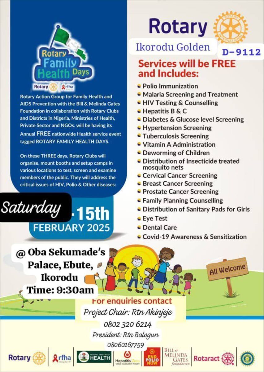 Join us for the ROTARY FAMILY HEALTH DAYS, a free medical outreach dedicated to families. This event is designed to provide essential healthcare services and resources to the community, ensuring everyone's health and well-being. Don't miss out on this opportunity to prioritize your health and that of your loved ones! π₯β€οΈ