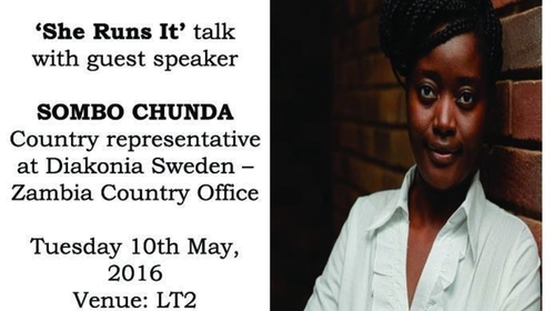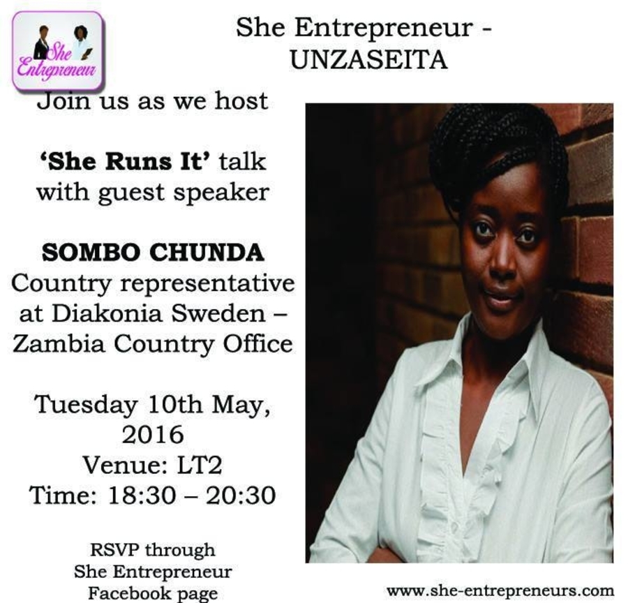She Entrepreneur invites all to the first talk after the recess. Our guest speaker SOMBO CHUNDA is a natural born leader, Chartered Accountant with an MBA and is currently serving as Country Representative of Diakonia Sweden- Zambia office.