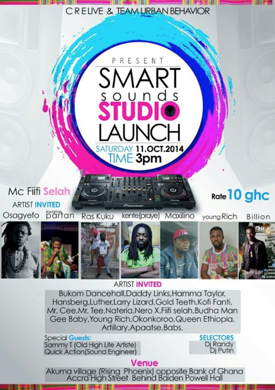 Crelive & Team Urban Behavior presents "Smart Sounds Studio Launch", happening live at the Akuma Village opposite Bank of Ghana Accra Hight Street.
