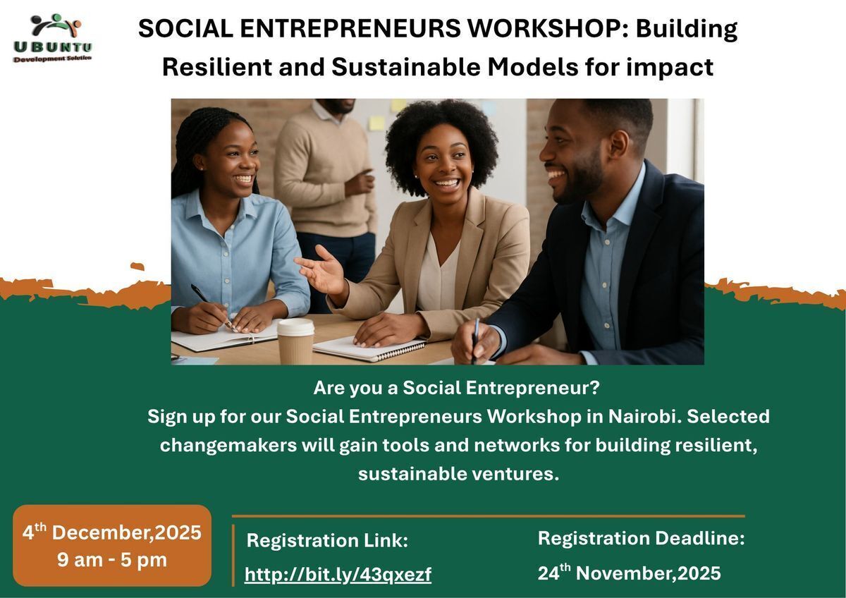 ๐ Join us for an inspiring full-day workshop in Nairobi! Ubuntu Development Solution is bringing together passionate social entrepreneurs eager to strengthen their ideas and build ventures that last. Expect engaging stories, practical challenges, and actionable solutions to elevate your impact. ๐ก