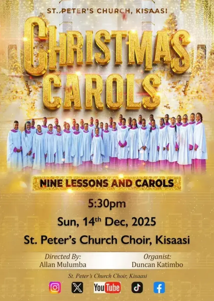 Join the festive celebration at St Peter's Church Kisaasi for an enchanting evening of Christmas Carols. Experience the joy of the season with soulful performances by Allan Mulumba and Duncan Katimbo. Immerse yourself in the spirit of Christmas through music and community, creating unforgettable holiday memories.
