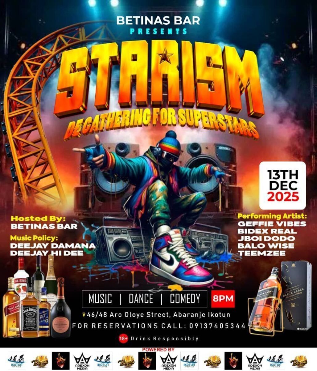 Experience an electrifying atmosphere filled with vibrant energy, captivating performances, and a celebration of artistry at STARISM ✨⭐✨. This event promises an immersive experience where music, entertainment, and community converge in Lagos. Join us for an unforgettable night of fun, connection, and inspiration. 🎉✨