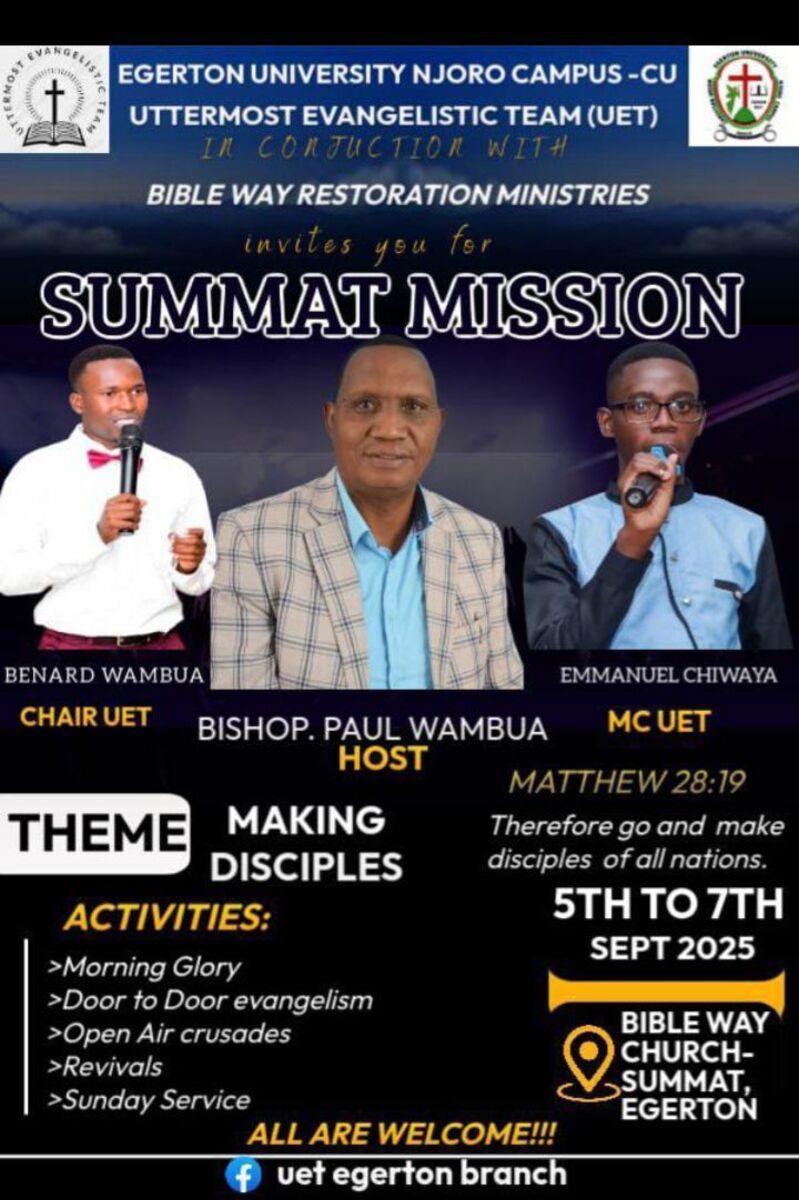 Join us for SUMMAT MISSION, a powerful gathering hosted at Egerton University Njoro. This event is a call to action, centered around the Great Commission from Matthew 28:19, inspiring participants to make disciples and spread the message of Christ Jesus. Expect an uplifting atmosphere filled with worship, prayer, and community fellowship as we come together to celebrate faith and purpose. ✝️🙌
