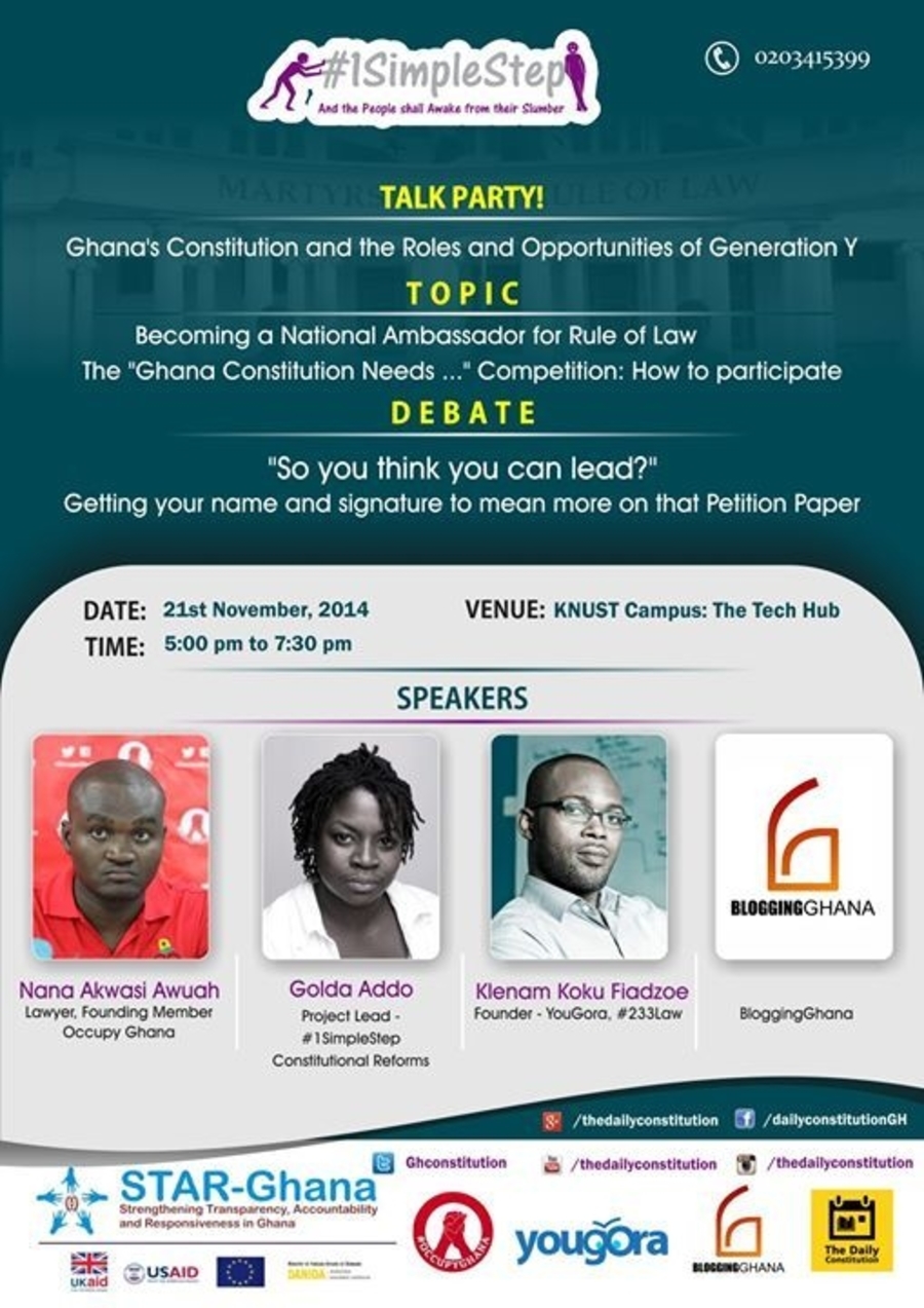 KNUST, are you ready? The Daily Constitution is headed your way. Join us at the Tech Hub on the 21st of November, 5:00pm. Come, let's talk over some food and drinks. Let's get you on the path to becoming National ambassadors for the rule of law.