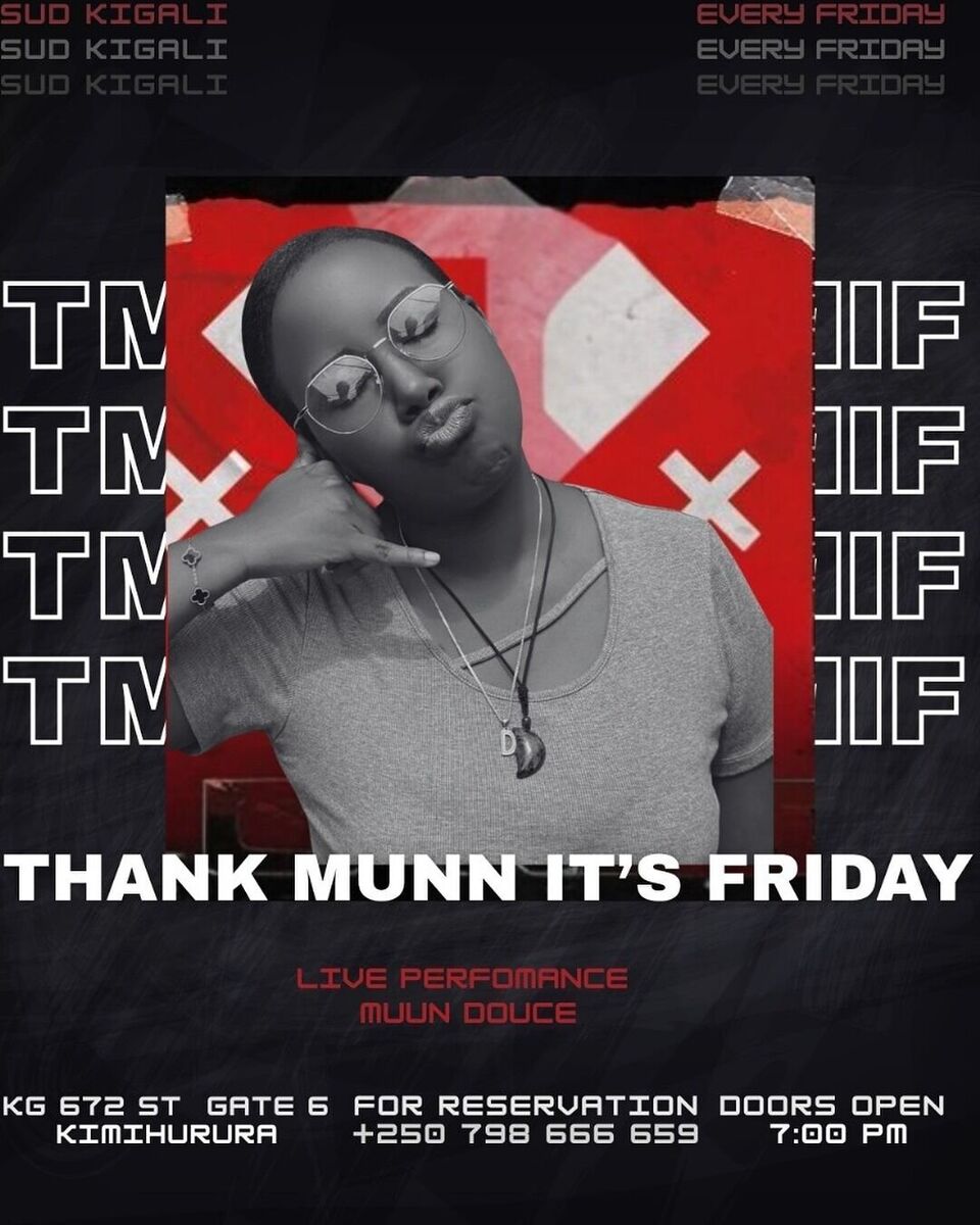 Kick off your weekend in style with Thank Muun It's Friday at Sud Kigali! This is your ultimate Friday night destination to let loose and soak in the electric vibes of Kigali's nightlife. Get ready to dance the night away with an incredible lineup of DJs, including DJ Muun, DJ June, and DJ Alida, who will keep the beats pumping. Bring your friends and immerse yourself in an unforgettable party atmosphere that's all about fun and celebration!