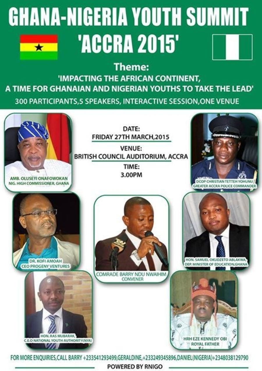 SCOPE OF THE EVENT: THE GHANA – NIGERIAN YOUTHS DIASPORA SUMMIT 2015 is put together by REBRAND NIGERIAN YOUTH IN GHANA ORGANISATION, the Theme: 'Impacting the African Continent - A time for Ghanaian and Nigerian Youths to take the Lead'...... 5 Speakers, Interactive Session, One Venue.....