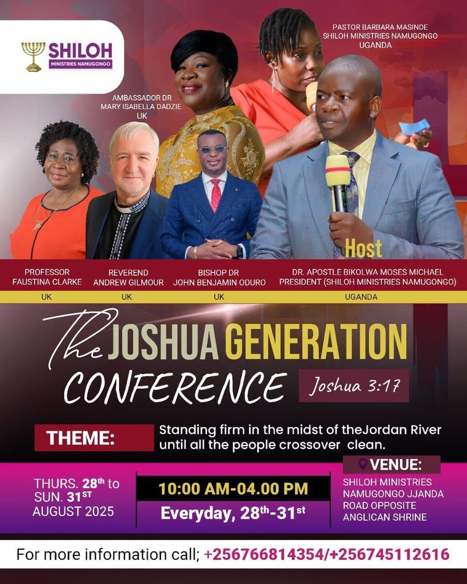 🌟 Calling all believers! Are you ready to stand firm in the Jordan and cross over clean? Join us at The Joshua Generation Conference, happening from August 28 to August 31, 2025. This empowering event takes place at Shiloh Ministries Namugongo and features powerful teachings from renowned speakers such as Amb. Dr. Mary Isabella Dadzie, Prof. Faustina Clarke, and our host Dr. Apostle Bikolwa Moses Michael. Daily sessions run from 10 AM to 4 PM, providing an opportunity to level up your faith and cross into your divine purpose! 🙌✨
