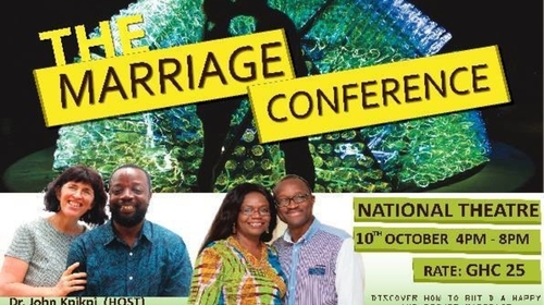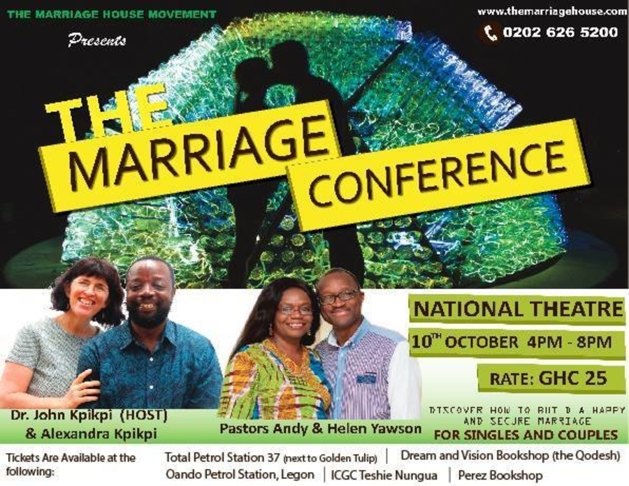 The Marriage House Movement presents THE MARRIAGE CONFERENCE for singles and couples. This National Conference is brought to the general masses to discover how to build a HAPPY and SECURE MARRIAGES. Tickets are sold for only 25 Ghana Cedis. Call +233 (0) 202 626 5200