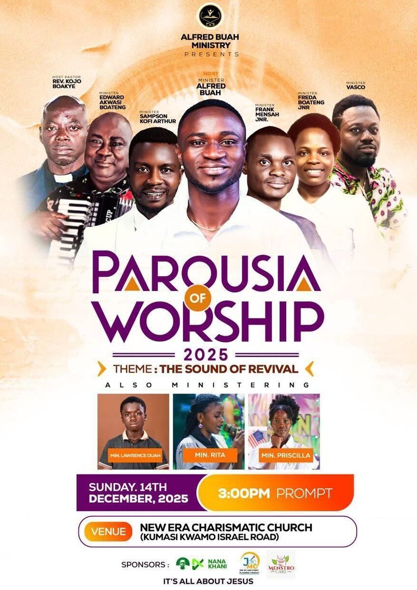 🌟 Join us for The Parousia of Worship, a soul-stirring musical event designed to uplift and inspire. Experience an atmosphere filled with divine praise, heartfelt melodies, and spiritual renewal. Whether you're seeking a moment of worship, community connection, or musical excellence, this event promises an unforgettable experience. Come and be part of a vibrant gathering that celebrates faith and music in harmony! 🎶✨