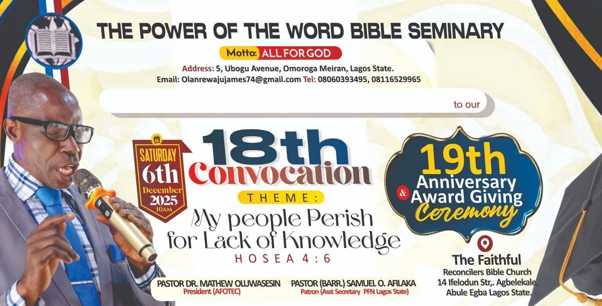 π Celebrate a milestone of faith and knowledge! The Power of The Word Bible Seminary marks its 19th Anniversary and 18th Convocation with an inspiring event designed to elevate your spiritual journey. Join us for an evening of worship, teachings, and community gathering that promises to uplift and empower. Whether you're a student, a worshipper, or a curious soul, this event offers a chance to connect, learn, and celebrate divine wisdom. Don't miss this special occasion to honor faith and education, and be part of a memorable spiritual experience! β¨π