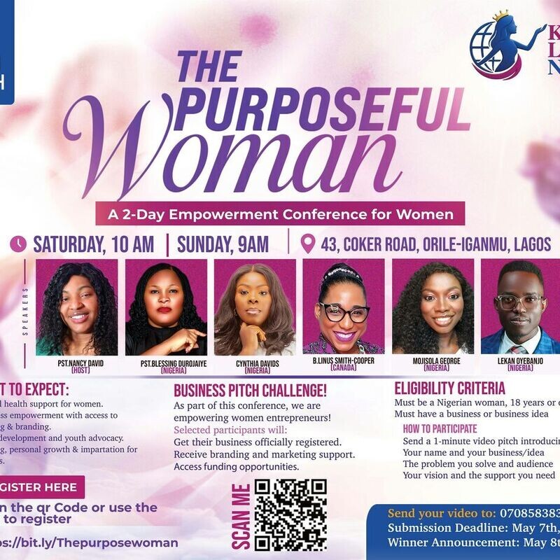 The Purposeful Woman is a transformative 2-day empowerment conference designed specifically for women to grow, heal, network, and pitch their businesses for funding and support. Hosted by the Kingdom Ladies Network, this event will feature dynamic speakers, business empowerment sessions, mental health support, child advocacy talks, and an exciting business pitch challenge for women entrepreneurs. Join us at 43 Coker Road, Orile-Iganmu, Lagos on May 10th and 11th, 2025 for a time of healing, personal growth, and branding opportunities!