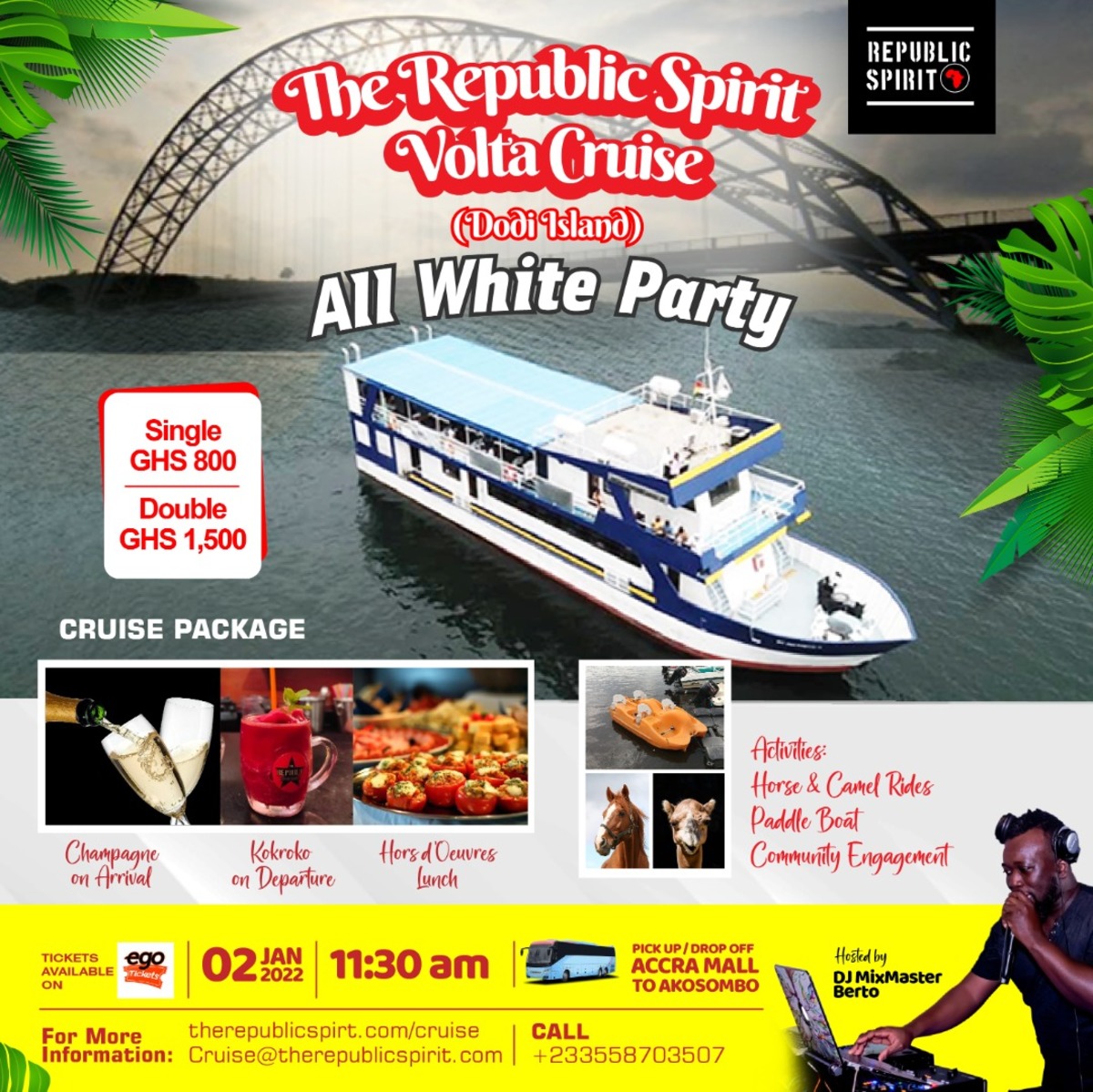 Begin the year by taking a breath of fresh air on The Republic Spirit Volta Cruise. This cruise takes a journey from the Akosombo Harbour to the sacred Dodi Island.