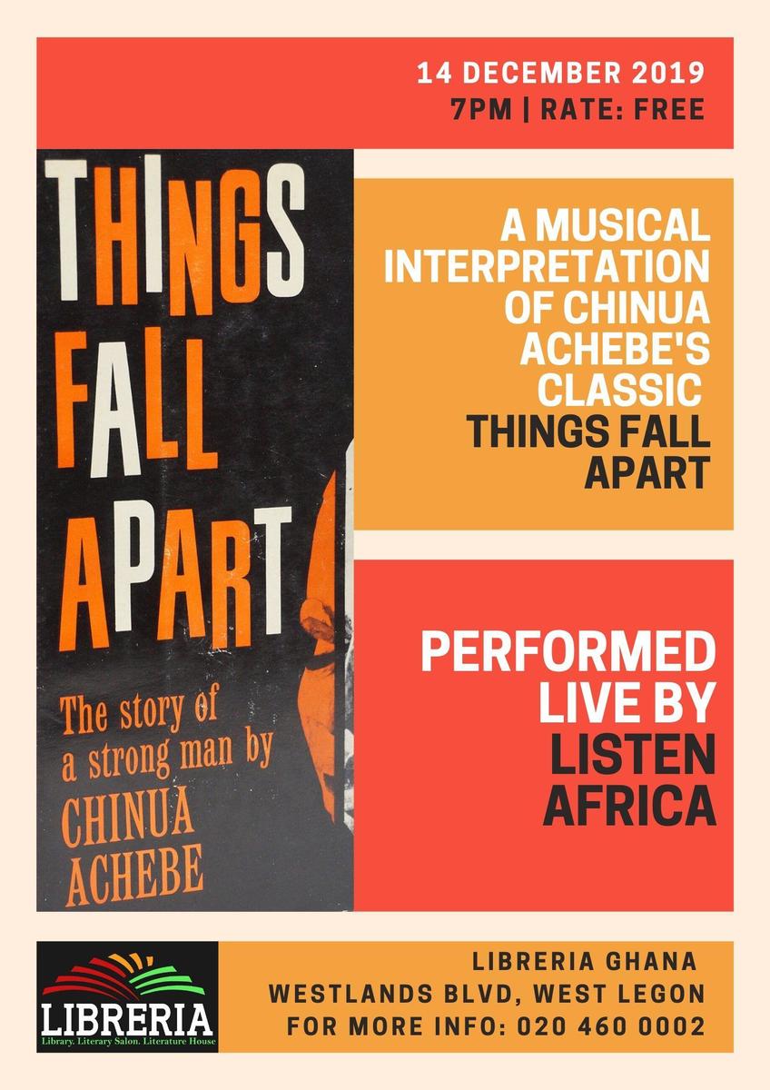 Join us this Saturday for a stunning musical interpretation of Chinua Achebe’s classic novel, Things Fall Apart, performed live, in our courtyard, with a full band by Listen Africa!