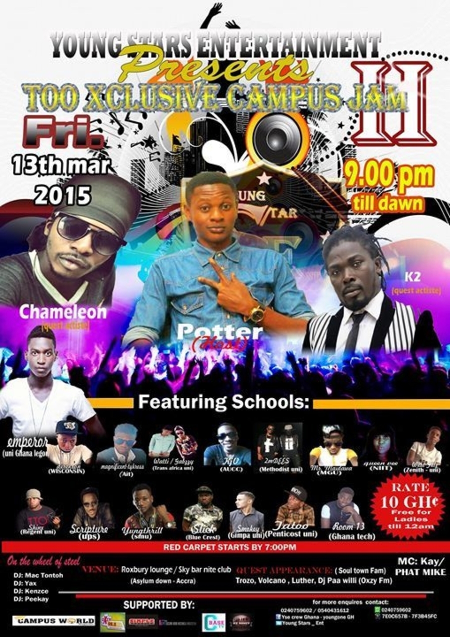 TOO XCLUSIVE CAMPUS is an event specially set aside for all tertiary institutions in Ghana to come together and have fun, share knowledgeS, its a program that also gives upcoming n underground arts the platform to showcase their GOD giving talents to the world. 1 good artiste from 15 schools has been selected to represent their schools at the program either in music or comedy.