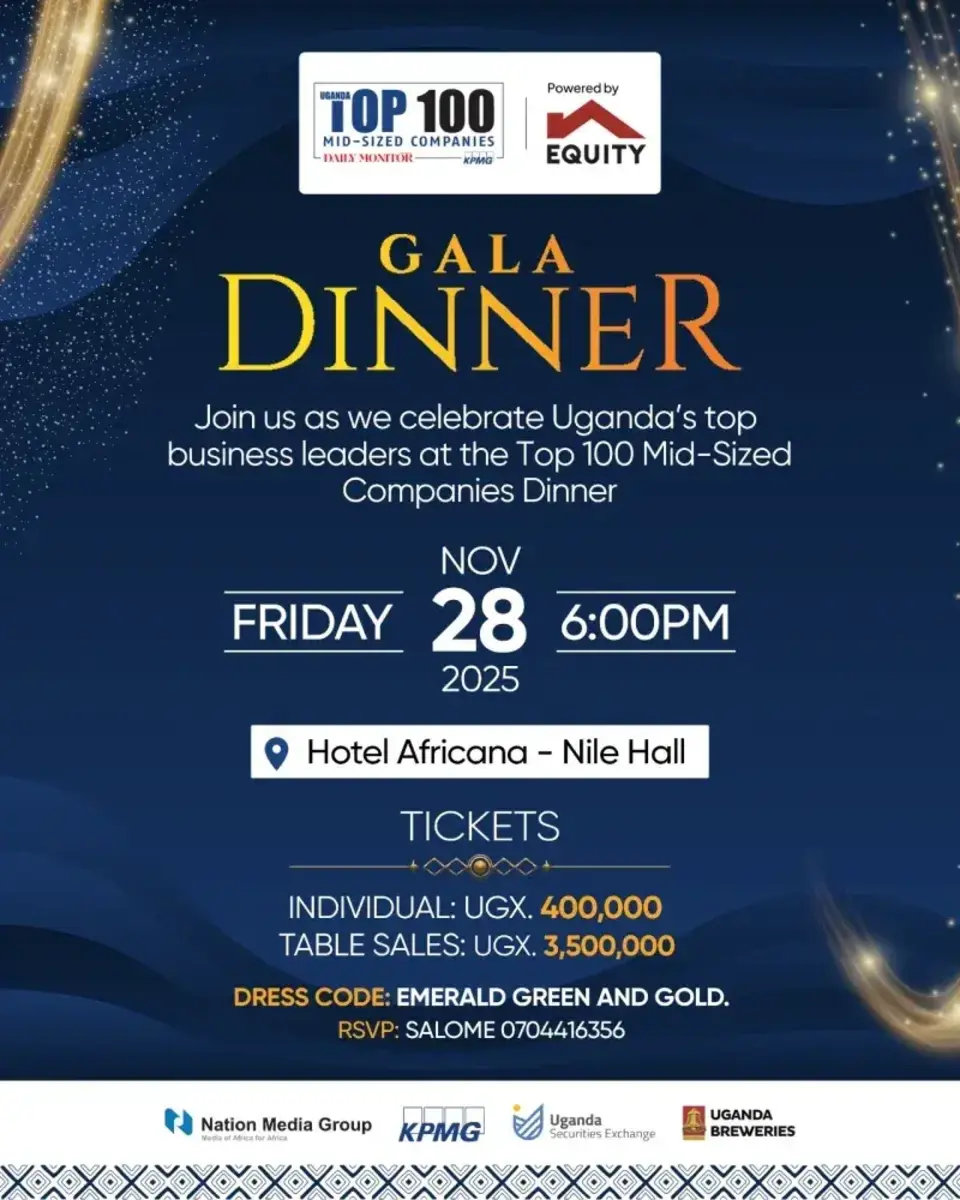 Experience an evening of prestige at the Top 100 Mid-Sized Companies Gala Dinner, where Uganda's most influential business leaders come together to honor excellence and achievement. Celebrate the driving forces behind innovation and growth in the mid-sized business sector at this exclusive gathering. Network with visionaries and be inspired by stories of success that are shaping the future of Uganda's economy.