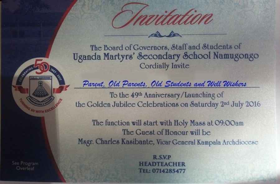 The Board of Governors, Staff and Students of Uganda Martyrs SS Namugongo Cordially Invite, Parents, Old Parents, Old Students and Well Wishers to the 49th Anniversary/ Launching of the Golden Jubilee Celebrations on Saturday 2 July 2016; Beginning with Holy mass at 9am.