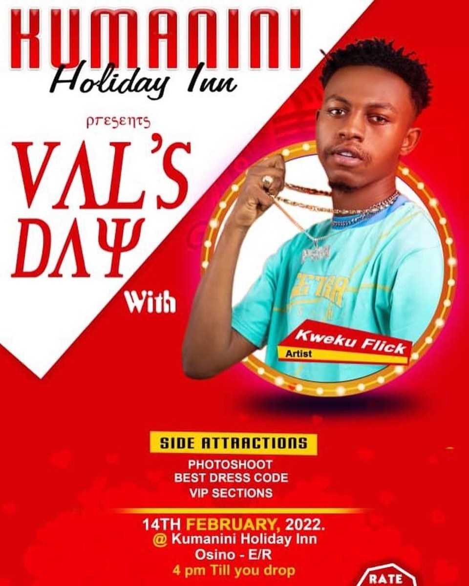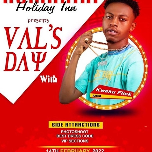 Val's Day with Kweku FlickMy Eastern region people let’s meet at kumanini Holiday Inn today at Osino.It’s all about Val’s day with your King of melodies