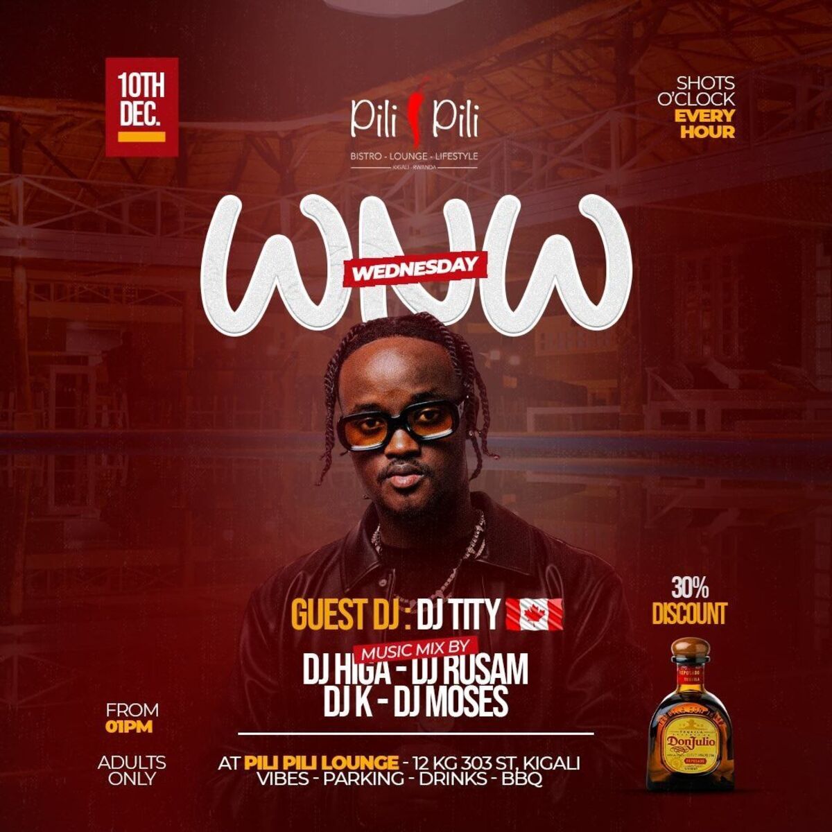 Get ready to wrap up the month in style at WNW Wednesday! Dive into an electrifying midweek party with good vibes, live Champions League action, and nonstop beats by top DJs like Rusam, Higa, and K. Plus, don't miss the special guest appearance by Ugandan DJ Etania. With Shot O'Clock every hour, this is the ultimate night to let loose and enjoy Kigali's best party scene!