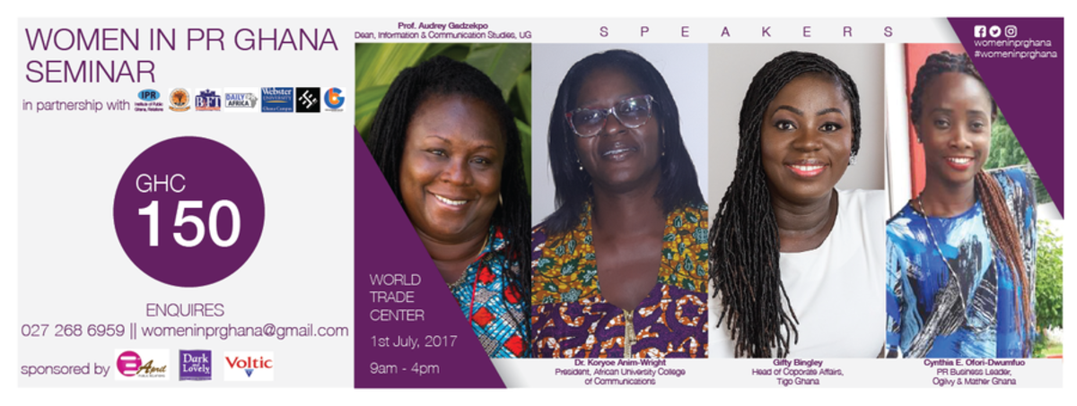 Women in PR Ghana Seminar is a (1) day professional and networking event targeted at Women in the Public Relations, Communications and Media industry. Even though it is a Women's event, it is open to men as well. For further information, kindly contact Faith on 0272686959 or email womeninprghana@gmail.com