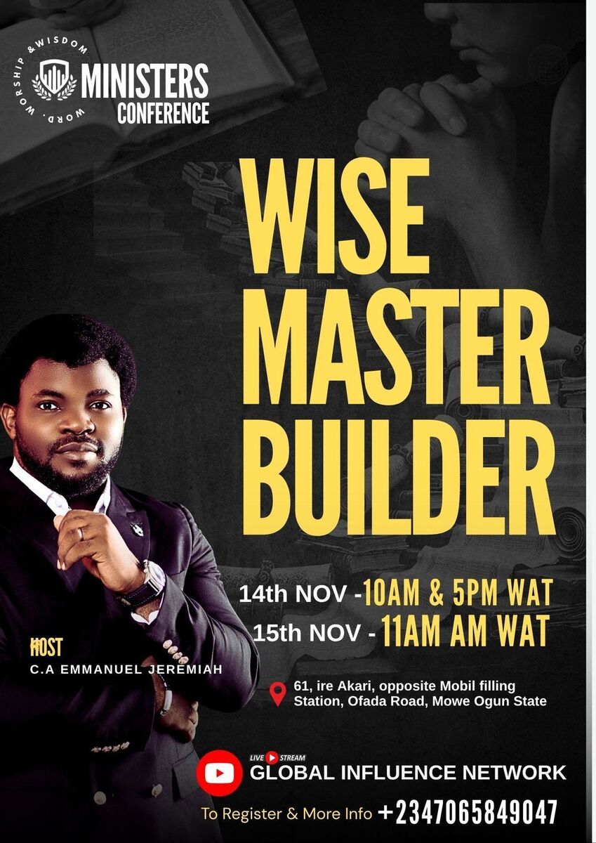 Join us for this inspiring Ministers Conference designed for all believers, especially young ministers in God's vineyard. Theme: Wise Master Builder! π§