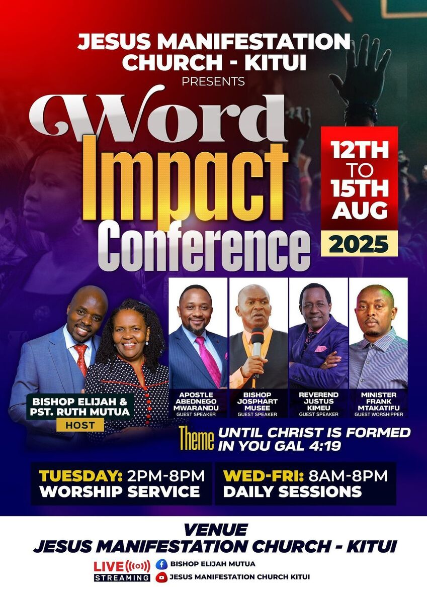 Prepare yourself for a divine encounter that promises to transform your life! Join us at Jesus Manifestation Church - JMC Kitui from August 12th to 15th, 2025 for an inspiring and powerful spiritual gathering.