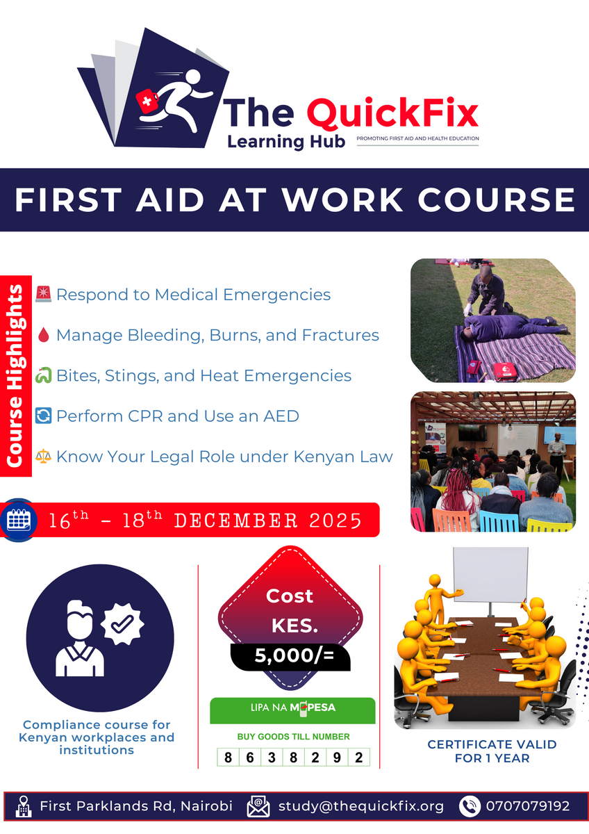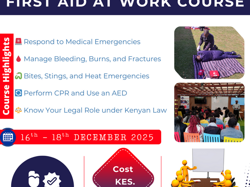 This compliance-driven program delivers comprehensive first aid training aligned to Kenyan Occupational Safety Regulations. The course empowers employees, safety officers, supervisors, and frontline responders with the competencies required to manage workplace medical and injury emergencies confidently and effectively.