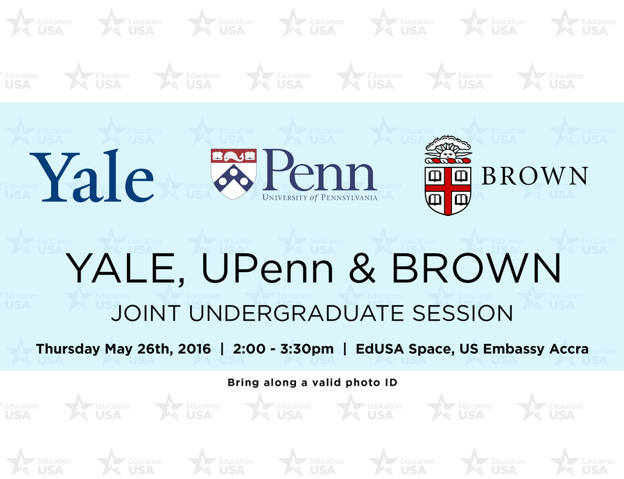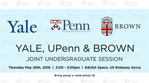 Yale, UPenn and Brown will hold a joint information session on Thursday, May 26 at 2pm at the EducationUSA Center, U.S. Embassy on how to apply to their colleges, scholarship opportunities and why you should choose their colleges.