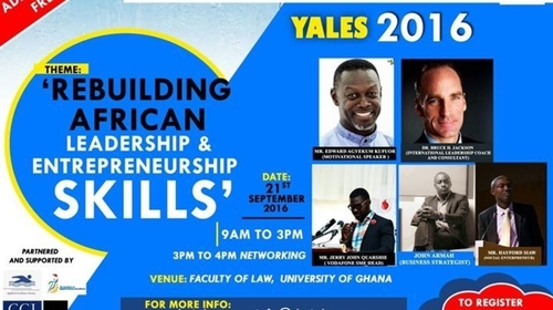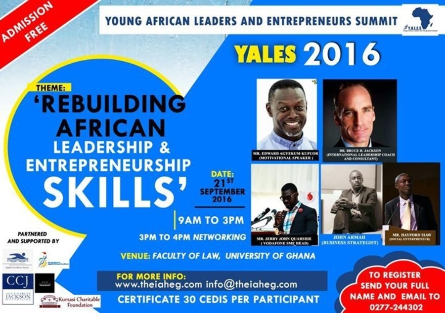 YALES 2016 Theme "Rebuilding African Leadership and Entrepreneurship Skills" Discussions would based on how the young leaders of the African continent can contribute to national and transnational growth by developing their leadership and entrepreneurship skills and creating enterprises to solve problems of the African continent. It will also look at how the youth can create opportunities for themselves and the future generations. Get opportunity to be sign on free online leadership development course. Certificate is 30cedis per participant Please text your full name and email address to +233-277-244302 to register Admission is free!