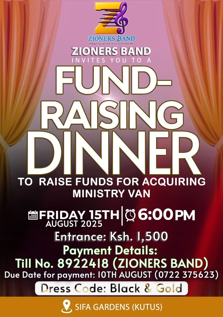 Join us for a special evening of soulful music and community support at the Zioners Band Fundraising event! 🎶✨ Experience an inspiring night at Sifa Gardens, Kutus, where the band will uplift your spirits with their melodious performances. This event is more than just entertainment—it's a chance to support a meaningful ministry initiative. Expect an engaging dinner, lively performances, and an opportunity to make a difference. Don’t miss out on this musical celebration that brings people together for a great cause! ❤️🎵